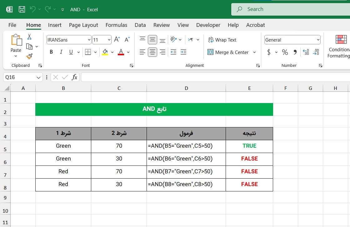 همان طور که در مثال زیر مشاهده می کنید، همه فرمول های ردیف های 5 تا 8 یکسان هستند. اما فقط در شرایطی نتیجه تابع AND برابر True می باشد که هر دو شرط 1 و شرط 2 برقرار باشند.