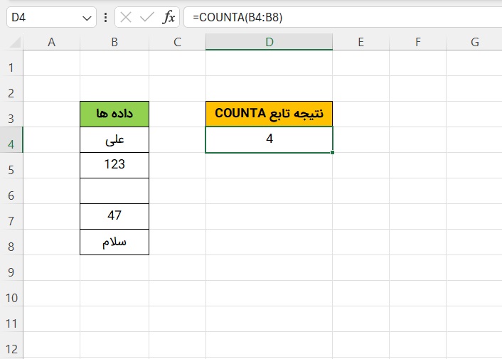 =COUNTA(B4:B8)نتیجه برابر خواهد بود با 4، چون چهار سلول دارای مقدار و یک سلول خالی است.